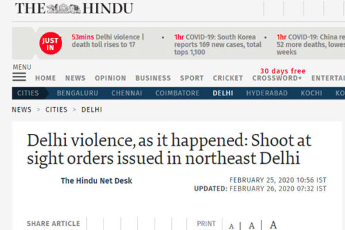 ভারতের দিল্লিতে নাগরিকত্ব সংশোধনী আইনের বিরোধী ও সমর্থকদের সংঘর্ষে এ হতাহতের ঘটনা ঘটেছে। সূত্র: দ্য হিন্দু